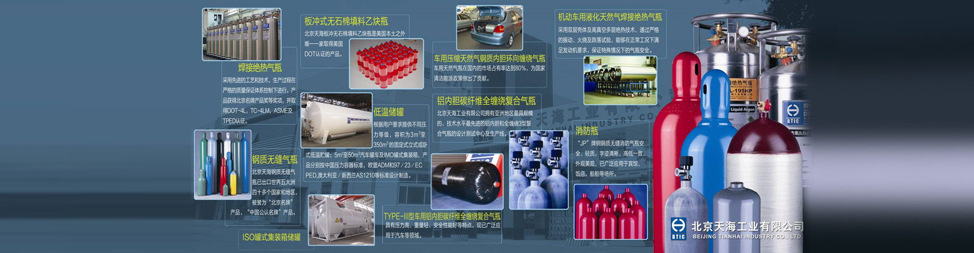 北京天海工業(yè)有限公司(以下簡(jiǎn)稱“天海工業(yè)”)是北京京城機(jī)電控股有限責(zé)任公司所屬北京京城機(jī)電股份有限公司(簡(jiǎn)稱京城股份,H股證券代碼00187,A股證券代碼600860)主要骨干企業(yè),是擁有七個(gè)專業(yè)氣體儲(chǔ)運(yùn)裝備生產(chǎn)基地(天海氫能、上海天海、天津天海、寬城天海、明暉天海、天海低溫、江蘇天海)及一個(gè)美國(guó)公司的集團(tuán)公司。天海工業(yè)及下屬子公司具有A2級(jí)高壓容器、B1級(jí)無(wú)縫氣瓶、B2級(jí)焊接氣瓶、B3級(jí)纖維纏繞氣瓶、B4級(jí)低溫絕熱氣瓶、B5級(jí)溶解乙炔氣瓶、C2級(jí)罐式集裝箱、D級(jí)中低壓容器的設(shè)計(jì)和生產(chǎn)資質(zhì)??缮a(chǎn)800余個(gè)品種規(guī)格的鋼質(zhì)無(wú)縫氣瓶、玻璃纖維環(huán)向纏繞氣瓶、碳纖維全纏繞復(fù)合氣瓶(含三型瓶、四型瓶、呼吸器)、無(wú)石棉填料乙炔瓶、焊接氣瓶、焊接絕熱氣瓶(含車(chē)用)、固定式壓力容器、低溫罐式集裝箱、船用罐、CNG/LNG/H2車(chē)載供氣系統(tǒng)及加氣站等系列產(chǎn)品,廣泛應(yīng)用于汽車(chē)、化工、消防、醫(yī)療、石油、能源、城建、食品、冶金、機(jī)械、電子等行業(yè)。
