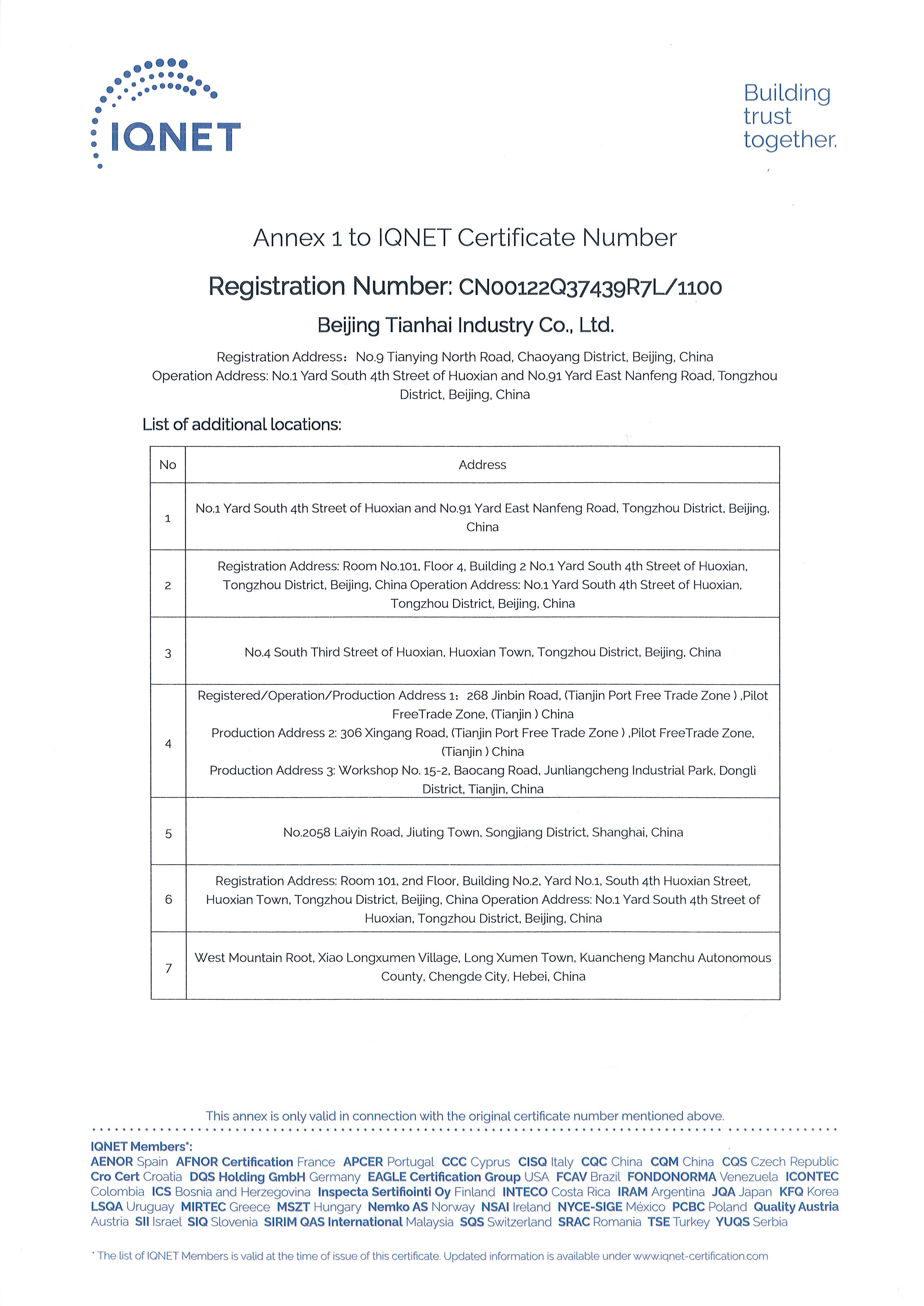 2010年9月,天海工業(yè)為保證品牌質(zhì)量,保證產(chǎn)品一致性,建立了集團(tuán)一體化ISO9001質(zhì)量管理體系,通過中國質(zhì)量認(rèn)證中心的集團(tuán)式認(rèn)證并取得證書。
