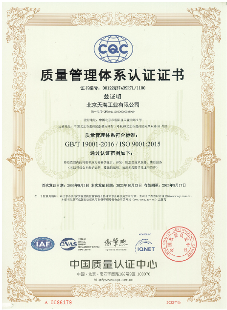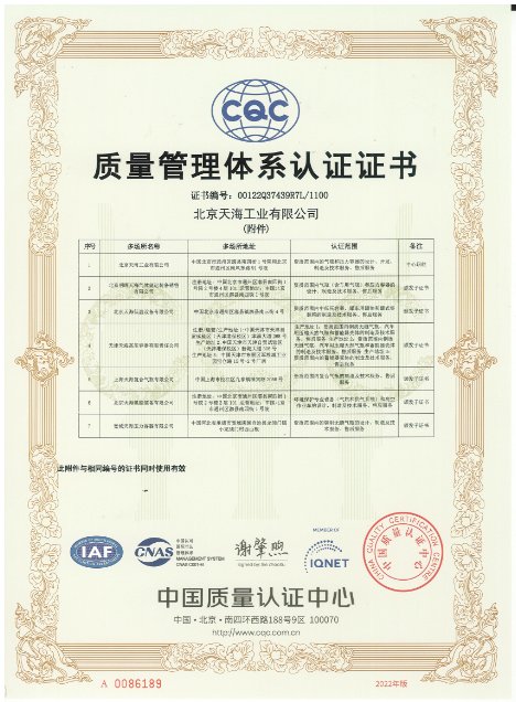 2000年4月,天海工業(yè)建立了ISO9001:1994質(zhì)量管理體系,通過中國質(zhì)量認(rèn)證中心的認(rèn)證并取得證書。
