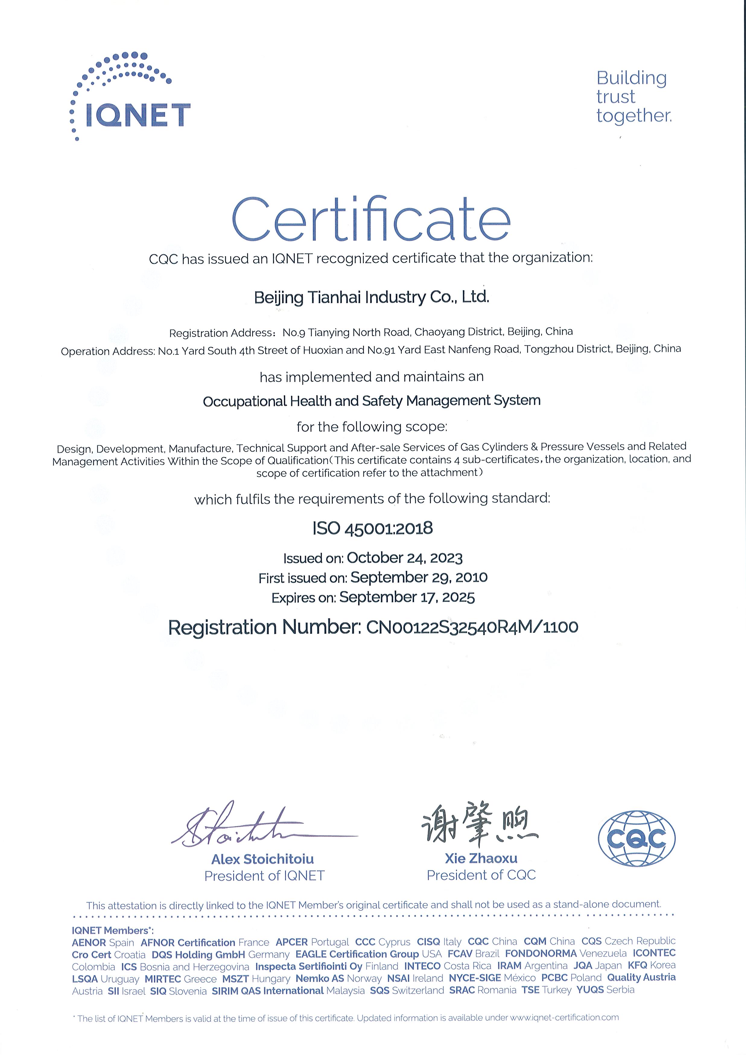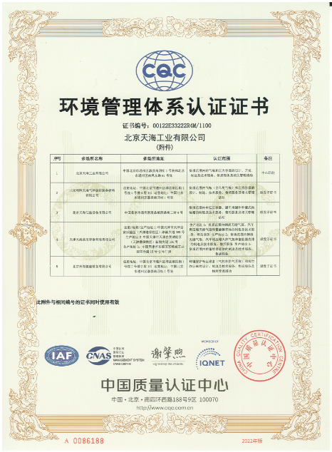 2010年-2015年,天海工業(yè)陸續(xù)建立了ISO14001和OHSAS18001環(huán)境和職業(yè)健康安全管理體系,整合了天海工業(yè)“三體系”,通過中國質(zhì)量認(rèn)證中心的認(rèn)證并取得證書。
